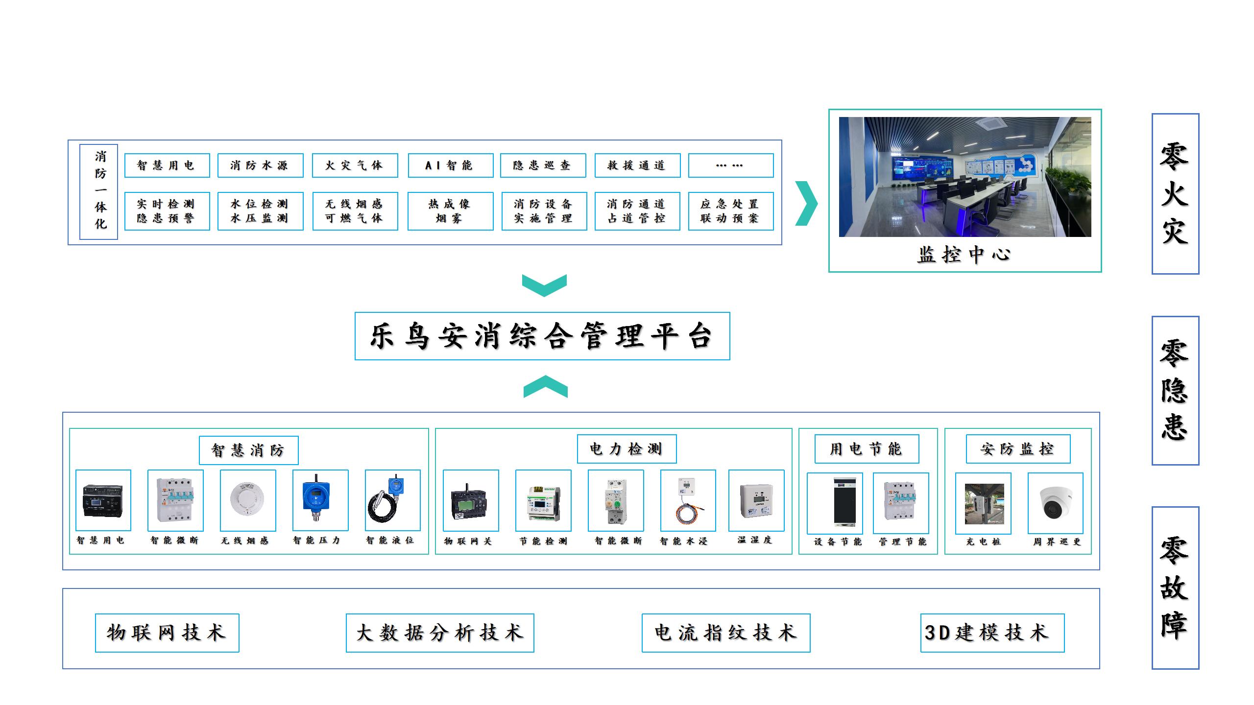 樂鳥“智慧消防”運維解決方案,以“智能空開”為硬件基礎,以“云平臺+運營服務”為核心,共同打造了智慧消防安全管理新體系。